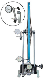 Der Zentrierständer mit der Bremsscheibenmesseinheit ist aus massivem Stahl und hochfestem Aluminium. Die Meßuhren für Seiten- und Höhenschläge messen auf den Zehntel-Millimeter exakt und die optionale Messuhr für die Bremsscheibe sogar auf den Hundertstel-Millimeter genau. Gesichert wird die Nabe mittels Rändelschrauben oder über Steckachsenadapter und den Zentrierkonus (im Lieferumfang enthalten). Passend für alle Laufradgrößen