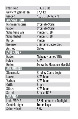 Das Pinion-Getriebe und der Gates-Riemen sind extrem wartungsarm und praktisch. Bei einem (unwahrscheinlichen) Defekt lässt sich der Riemen durch eine Kette ersetzen. Ein kleines Extralob verdienen die KTM-Teile: die Sattelstütze und der Vorbau haben sichere und leicht bedienbare Klemmungen, der Lenker ist bequem geschwungen.