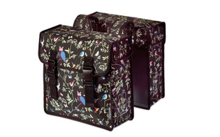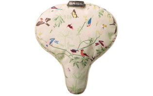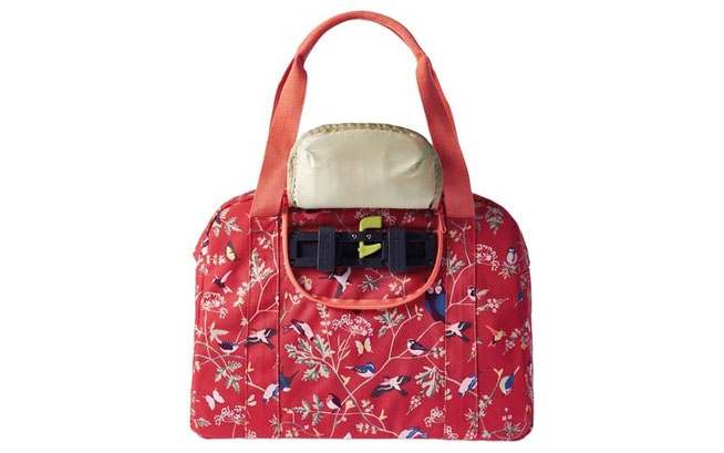 Bunte Vögel auf Ästen, liebevoll gezeichnet wie in einem Kinder-Memory. Die Kollektion ist in den Farben Kohle, Elfenbein und Vintagerot gehalten, man kann also die Farbe aussuchen. Die etwas kleinere Carry-All Bag (links, 42,95 Euro) ist der ideale Begleiter auf kurzen Citytouren, und die Doublebag (rechts, 44,95 Euro) mit einem großen Stauraum lässt einen auch auf längeren Strecken gut aussehen. Funktional und trotzdem chic ist auch der dazugehörige Basil Wanderlust Sattelbezug (oben, 11,49 Euro).