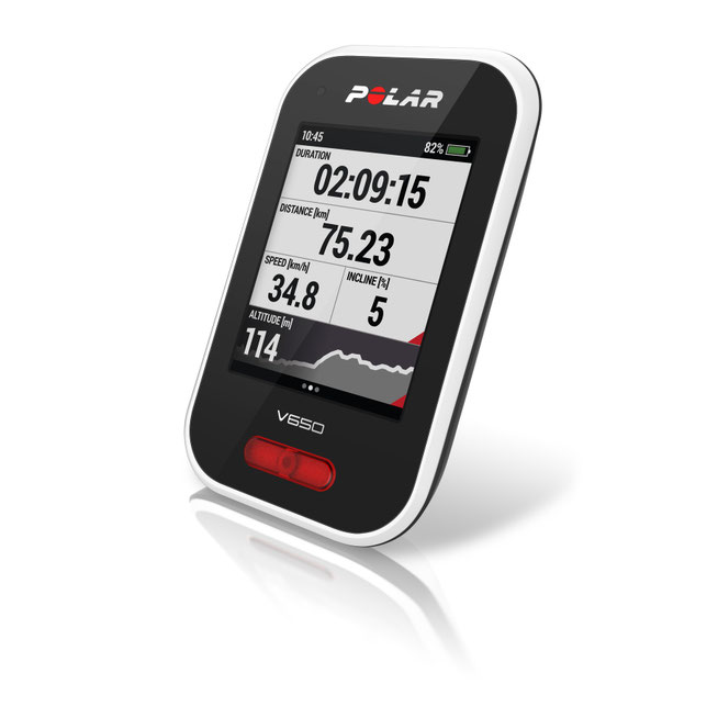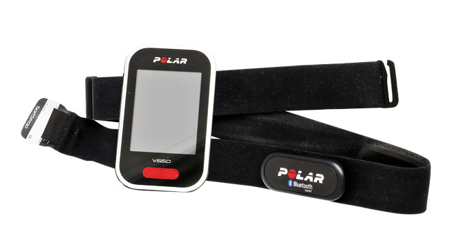 Der Polar V650 ist durchgestylt wie ein kleines Smartphone, schon die Verpackung macht einen wertigen Eindruck. Überzeugende Hardware, das 2,8 Zoll große Display ist auch bei gleißendem Sonnenschein gut ablesbar; der Brustgurt wird über einen stabilen Mini-Bügel geschlossen statt per Druckknopf am Sensor. Verbindung über Bluetooth Smart. Praktisch: Die Mini-Vorderlampe lässt sich manuell oder automatisch in der Dämmerung einschalten. Individuelle Profile für mehrere Räder einstellbar. Hervorragend intuitive Bedienung, die Anleitung braucht man nur für Details. Der V650 wertet das Trainig aus, bewertet wird auf dem Gerät wie lange man in welcher Herzfrequenzzone trainiert; das Sofort-Feedback wird auf dem Display angezeigt.
