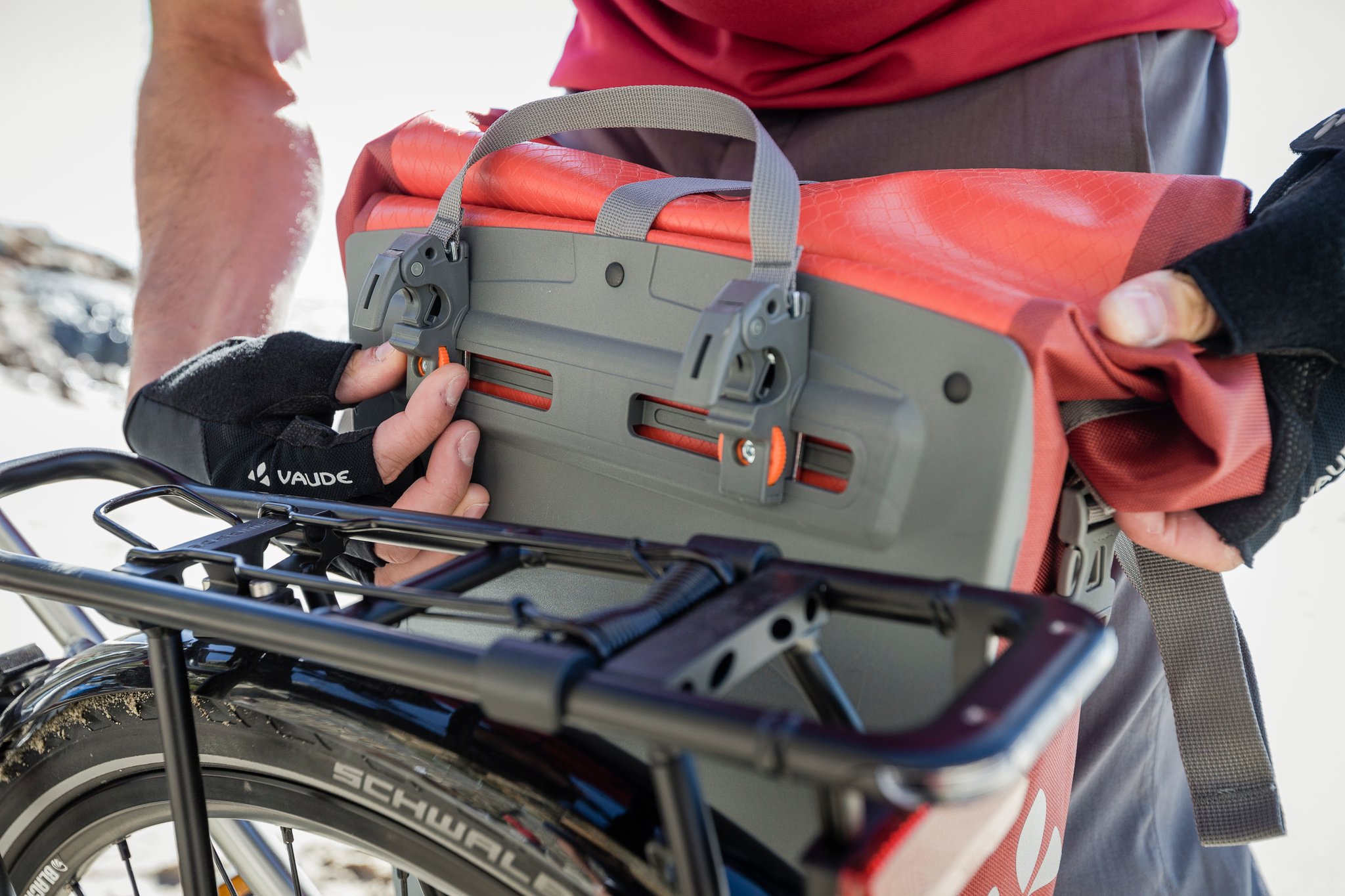 werden. Die Taschenrücken sind symmetrisch und können auf jeder Seite des Fahrrads angebracht werden. Das Sicherungssystem wurde ebenfalls weiterentwickelt. Mit einem kleinen Vorhänge- oder