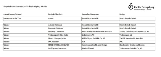 Bicycle Brand Contest bietet der Rat für Formgebung gerade hierfür einen geeigneten Wettbewerb, der durch eine unabhängige Jury einen Vergleich auf höchster Ebene ermöglicht."