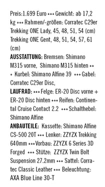 In Sachen Licht, leistet der AXA Blueline 30, ein kompakter dynamobetriebener Scheinwerfer mit einer Lichtstärke von 30 Lux, gute Dienste. Insbesondere der Speedlifter by Schulz hebt das Bike von der Masse der Trekkingbikes ab. Bei den übrigen Anbauteilen wurde die Eigenmarke ZZYZX verbaut.