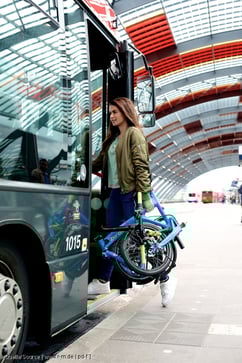 Im Fernbus: Vor der Fahrt wird das Rad in einer blickdichten Tasche verstaut. Praktisch dafür ist die schwarze Seglertasche von Brompton. Sie verfügt über Clip-Straps und Klettverschluss, mit welchen sie an Sattel und Sattelstütze montiert werden kann. Bei stark frequentierten Bussen gibt man als einer der letzten Fahrgäste das Gepäck ab oder verstaut es selbst. So findet das Faltrad im Gepäckfach „weiter oben“ Platz und wird nicht erdrückt. Sind Fernbus und Gepäckfach eher leer, ist es hilfreich, das „Gepäck“ vor Umherrutschen im Fach mit Spanngurten zu sichern.