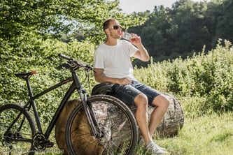 Richtiges Trinken ist für Radsportler immer wichtig. Das bedeutet aber nicht, Unmengen an gekühlter Flüssigkeit schnell in sich hineinzukippen. Radsportler sollten eher darauf achten, dass sie gleichmäßig und stetig trinken, am besten bevor sich ein Durstgefühl einstellt. Als Getränke bieten sich Wasser oder gemischte Fruchtsäfte an. Empfohlen wird ca. ein Liter Flüssigkeit pro Stunde Radfahren. Deshalb sollten zwei Flaschenhalter (z. B. „FH2“ von Voxom /ab 12,95 Euro) am Rad montiert sein. Bei der Ernährung wirkt ein wasserhaltiges, gut verdauliches Obst erfrischend. Alkohol, selbst in geringen Mengen, ist hingegen tabu und kann zu Kreislaufproblemen führen.