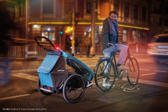 Seit Jahresbeginn 2018 ist Beleuchtung an Kinder- und Transportanhängern vorgeschrieben. Anhängerspezialist Croozer hat für sein Modell „Kid plus“ (ab 849 Euro) als erster Hersteller eine integrierte Lichtlösung entwickelt und hat das Licht direkt in den Anhängergriff verbaut. Es ist sensorgesteuert, schaltet sich also automatisch bei Bewegung und Eintreten der Dunkelheit ein. Eine Nachleuchtfunktion von vier Minuten entspricht etwa der Standlichtfunktion an Fahrrädern, gibt also Sicherheit beim Stehen an der Ampel. Die Akkus können per USB aufgeladen werden und halten bis zu 15 Stunden.