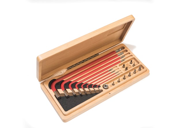 Die gängigsten acht Innensechskantschlüssel (Größen: 2, 2,5, 3, 4, 5, 6, 8, 10 mm) hat der US-Spezialist für Fahrradwerkzeuge in diese noble, CNC-gefräste Schatulle aus Birkenholz gepackt.