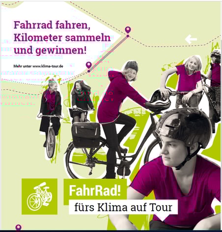 Die bundesweite Kampagne „FahrRad! Fürs Klima auf Tour“ vom ökologischen Verkehrsclub VCD ruft zusammen mit dem Kooperationspartner „AKTIONfarRAD“ Jugendliche dazu auf, mit dem Fahrrad zur Schule zu fahren und somit das Klima zu schützen. Jugendliche in ganz Deutschland können von März bis August an der Aktion teilnehmen, ihre mit dem Rad zurückgelegten Kilometer auf der Seite www.klima-tour.de sammeln und zum Ende des Projekts im September Preise gewinnen.