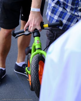 Als fahrradaffiner Vater lasse ich in der Zwischenzeit meinen Blick über die Fahrzeuge der Konkurrenten kreisen. Die Puky-Quote ist auffällig hoch. Lea sticht mit ihrem neuen grünen Puky-Laufrad „LR 1 L Br“ dennoch aus der Masse heraus, denn viele der Räder sind augenscheinlich bereits in mehreren Generationen im Einsatz. Die qualitativ hochwertigen Laufräder haben einfach eine lange Haltbarkeit, was ich gerade unter dem Aspekt der Nachhaltigkeit sehr gut finde. Auch unser Laufrad wird sicherlich an die kleine Schwester weitergegeben, bevor es den Weg zu weiteren Verwandten und Bekannten macht. Positiv finde ich zudem, dass die Kinder behelmt fahren müssen. So wird ihnen gleich auf spielerische und selbstverständliche Art ein Sicherheitsmerkmal mit auf den Weg gegeben, an das sich auch so manches Elternteil halten sollte. Passend zum Laufrad trägt Lea deshalb einen grünen Abus-Helm und ein Vaude-Shirt mit der Aufschrift „Green Rebel“. Am Material liegt es schon mal nicht, wenn sie nicht den Sieg davonträgt, denke ich amüsiert.