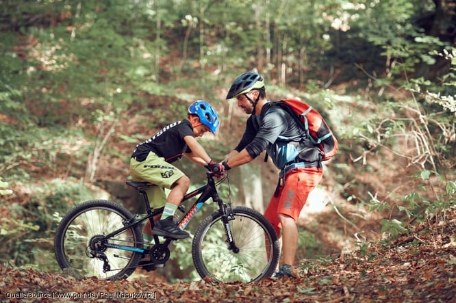 Beim Klettern und Sichern am und mit dem Seil spielt Vertrauen eine große Rolle. Diese Erfahrung übertragen wir gleich aufs Biken. Auch wenn das Material ideal ist: Ein paar Balance- und Kurvenübungen bereiten uns auf den anspruchsvollen Rückweg durch den Wald vor.