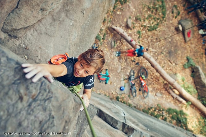 Jetzt sind die Arme dran. Der Ältere von uns hängt schnell das Seil von oben ein und sichert den Nachwuchsbergsportler. Die Radtour zum Felsen gab ihm auch genügend Zeit, sich aufzuwärmen. Die Bremse hier heißt übrigens Schwerkraft und statt eines Reifens sorgen Hände und Füße für die richtige Traktion. Alle Sinne an!