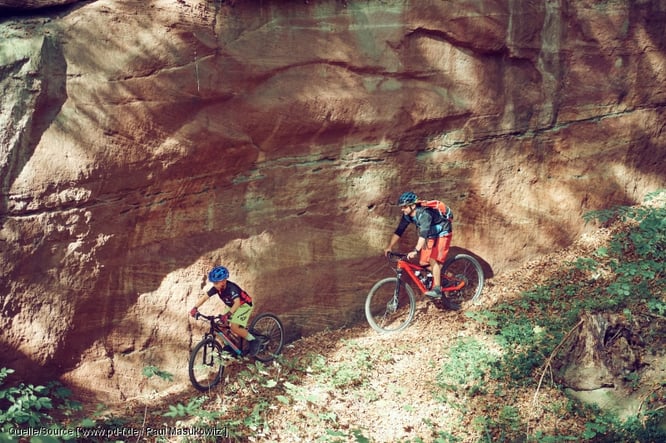 Vornweg zu fahren und den Trail im Laub zu suchen ist spannend. Die Anstrengung vom Klettern ist schon wieder vergessen und der Spaß auf dem Rad kommt auf diesen Trails entlang der Sandsteinfelsen ganz von alleine.
