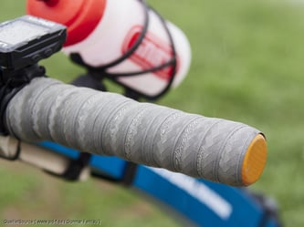 Aber warum setzten die Produktmanager diese offensive und zukunftsgewandte Ausstattung des Bike-Visual-Trainer nicht auch beim Cockpit fort? Satte 35 Millimeter misst der nicht außen konifizierte Lenker, der – ganz im Branchentrend zur Integration – auf einen wechselbaren Vorbau verzichtet und fest als Einheit mit dem Bike-Visual-Trainer verbunden ist. Das erlaubt keine individuelle Anpassung und zudem lassen sich keine herkömmlichen MTB-Griffe montieren. Ich habe mich deshalb für das unter Rennradfahrern sehr beliebte und 3,2 Millimeter starke Lenkerband „DSP“ von Lizard Skins entschieden. Das Wickeln folgt den Reflexen jahrelangen Rennradfahrens und ‑aufbauens und verläuft ohne weitere Auffälligkeiten. Holzlenker und Band verstehen sich gut; immerhin!