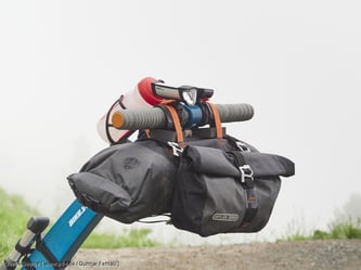 Die meisten Leser wissen es bestimmt: Ich bin großer Bikepacking-Fan. Und so wird jedes passende und auch unpassende Testmaterial hinsichtlich seiner Bikepacking-Tauglichkeit beäugt. Die „Frontroll“ von Ortlieb lässt sich einfach und straff am Bike-Visual-Trainer montieren. Sie stört im Fahrbetrieb nicht und interagiert nicht negativ mit der Lenkung. Dass die großen Querschnitte des Holz-Chassis die Montage eines „Framepacks“ verhindern, ist bedauerlich. Für die „Saddlebag“ finden sich leider weder Sattelstütze noch ‑gestell. Mein Urteil: Der Bike-Visual-Trainer schreibt das Setup aus Frontroll und Rucksack vor. Das ist okay für einen Overnighter, größere Touren wird man damit nicht bestreiten wollen.