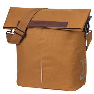 mit einer doppelten Fahrradtasche in Kamelbraun mit dem MIK-System zur einfachen Montage auf den meisten Gepäckträgern. Der Basil City