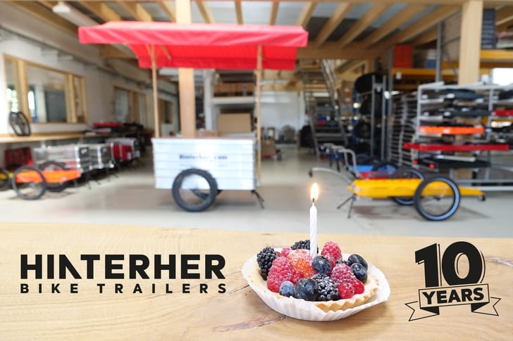 Neue Webseite, neuer Konfigurator, neues Logo, neuer Standort! Gründer und Geschäftsführer Peter Hornung schwirrt schon ein wenig der Kopf ob der vielen Neuheiten. Im Oktober feierte seine Firma mit einem großen Fest ihr zehnjähriges Bestehen. Begonnen hatte Hinterher einst in der Möbelwerkstatt von Schreiner und Architekt Peter Hornung. Mit seinen hochwertigen Fahrradanhängern aus Aluminium, die sich dank ihrer Form und dem durchdachten Baukastensystem besonders vielfältig einsetzen lassen, traf Hinterher ganz offenbar einen Nerv. Seitdem legt das Unternehmen ein rasantes Wachstum hin, gewann diverse Branchen- und Bundespreise und verkauft seine Fahrradanhänger in ganz Europa. „Der E-Bike-Boom beflügelt natürlich auch den Lastentransport. Plötzlich sind Distanzen und Lasten kein Thema mehr. Wer kompromisslose Qualität und Flexibilität sucht, landet dann bei uns“ so Hornung.