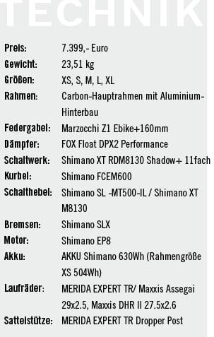 Die Sitzposition des e-ONE-Sixty ist ausgewogen, sodass man auf dem Bike hervorragend sitzt. Man tritt angenehm und effektiv und kann das Bike kontrolliert und flink um enge Kurven treiben. In technisch anspruchsvollen Passagen macht sich das recht hohe Gewicht bemerkbar. Bergauf liegt es ruhig und klettert zuverlässig, wobei der Motor laut summt, wenn ihm viel Leistung abgefordert wird. Angenehm ist der Charakter des EP8 im Trail-Modus, wo er im genau richtigen Maß anschiebt. In der Boost-Stufe kann es schon etwas ungestüm zugehen, wenn der Untergrund lose ist, oder man dosiert in kniffeligen Passagen manövriert. Bergab gefällt das E-One Sixty mit seiner Laufruhe und einem harmonischen, sehr schluck-freudigen Fahrwerk von Marzocchi (Gabel) und Fox (Federbein). Die Shimano XT wechselt die elf Gänge zuverlässig und exakt, die XT-Bremsen sind gewohnt gut zu dosieren und kraftvoll. Die Laufräder kombinieren Shimano XT-Naben und Merida-Felgen, auf denen griffige Maxxis-Pneus in 29“ und 27,5“ montiert sind. Vorn ein 2,5 Zoll (6,35 cm) breiter Assegai, hinten ein DHR II in 2,6 Zoll (6,6 cm).