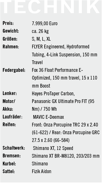 Für Letztgenannten setzt Flyer auf Panasonics GX Ultimate Pro Fit mit satten 95 Nm Drehmoment. Damit haben auch etwas festere Pilot:innen genug Schub am Berg, wenn das zulässige Gesamtgewicht von satten 140 kg annähernd ausgereizt wird. Geht es bergauf, über Stock und Stein, hilft das sogenannte Mullet-Konzept. Das Vorderrad rollt dabei mit seinen 29“ lässig über Hindernisse, das kleinere 27,5“ Hinterrad unterstützt die Agilität.