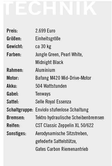 Zum Antrieb gehört eine stufenlos zu schaltende Enviolo Nabenschaltung, die genauso pflege- und wartungsarm ist wie der Carbon-Riemenantrieb von Gates. Bei entsprechender Pflege sollten Nabe und Riemen mehr als ein Fahrradleben lang halten.