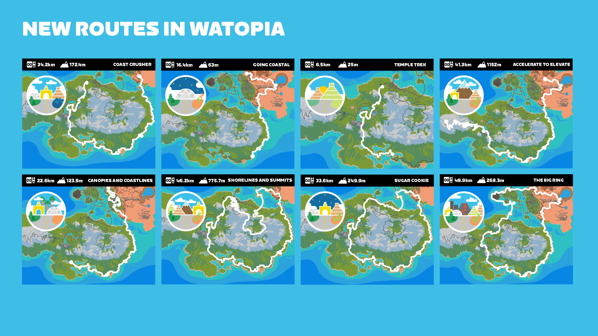 Diese neue Straße führt eng an der Küste von Watopia entlang und ist relativ flach. Es gibt vier neue Sprintabschnitte: Stoneway Spring, Acropolis Sprint, Sasquatch Spring und Woodland Sprint. Acht neue Strecken wurden entworfen - einige der längsten von Zwift! - die eine Kombination aus neuen und bestehenden Straßen nutzen: Coast Crusher (34 Kilometer und 172 Höhenmeter), The Big Ring (48 Kilometer und 268 Höhenmeter), Accelerate to Elevate (41 Kilometer und 1152 Höhenmeter, mit Ziel auf der Alpe du Zwift), Shorelines and Summits (46 Kilometer und 776 Höhenmeter, einschließlich des Epic KOM), Sugar Cookie (33 Kilometer und 250 Höhenmeter), Going Coastal (16 Kilometer und 63 Höhenmeter), Temple Trek (6 Kilometer und 25 Höhenmeter), und Canopies and Coastlines (22 Kilometer und 124 Höhenmeter). Vollständige Informationen zu den Routen gibt es hier.