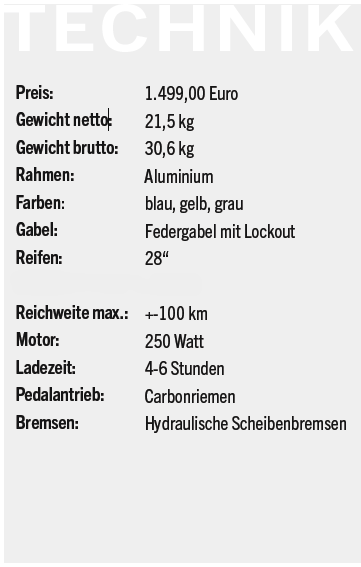 Die Pedalkraft wird über einen wartungsarmen Carbonriemen an das Hinterrad geleitet. Das LCD-Display ist gut ablesbar, und die Funktionen lassen sich intuitiv einstellen. Im Fahrbetrieb zeigt sich das Rad mit einem sehr sanft beginnenden Anschub, kommt aber dann rasch auf Touren und entlastet spürbar die Pedalkräfte.