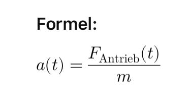 Ein Pedelec mit einer angenommenen Systemmasse von 200 kg erreichte im Test eine Beschleunigung von 0,835 m/s². Um diesen Wert zu erzielen, war eine Antriebskraft von 167