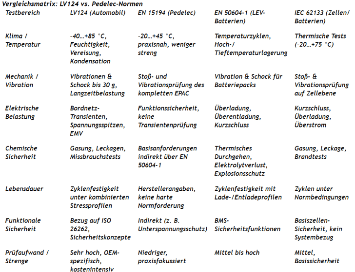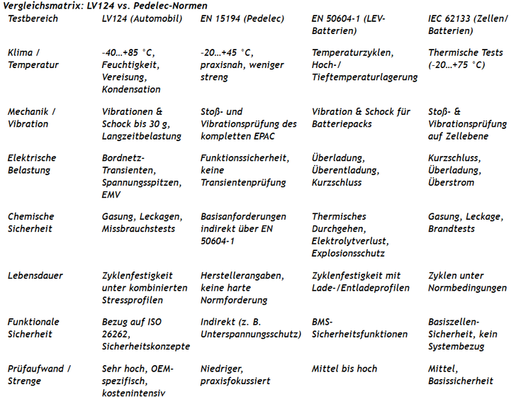 Während die EN 15194 den Schwerpunkt auf Anwendersicherheit legt, liefert die EN 50604-1 eine technisch fundierte Basis für Batterietests im LEV-Bereich. Ergänzt durch die IEC 62133 auf Zellebene ergibt sich ein solides Fundament. Die LV124 geht jedoch in vielen Bereichen weiter – und bietet damit Potenzial, Pedelec-Batterien künftig robuster und sicherer zu machen.