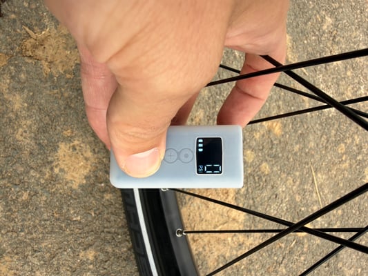 Mit nur 87 Gramm Gewicht und Maßen von etwa 65 × 47,5 × 28 mm passt sie problemlos in jede Satteltasche. Trotz der geringen Größe erreicht sie laut Hersteller einen Maximaldruck von 120 PSI (8,3 bar), was sie auch für Rennradfahrer interessant macht. Der integrierte lässt sich in rund 25 Minuten per USB-C vollständig aufladen und reicht in der Praxis aus, um etwa drei schmale Rennradreifen auf 80 PSI zu befüllen.