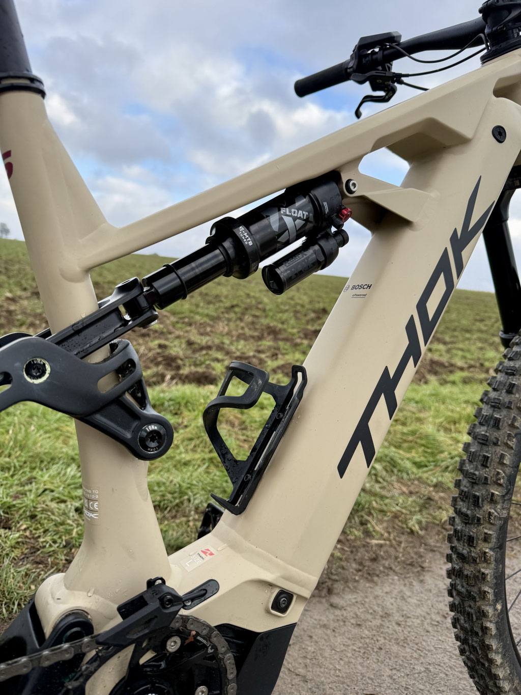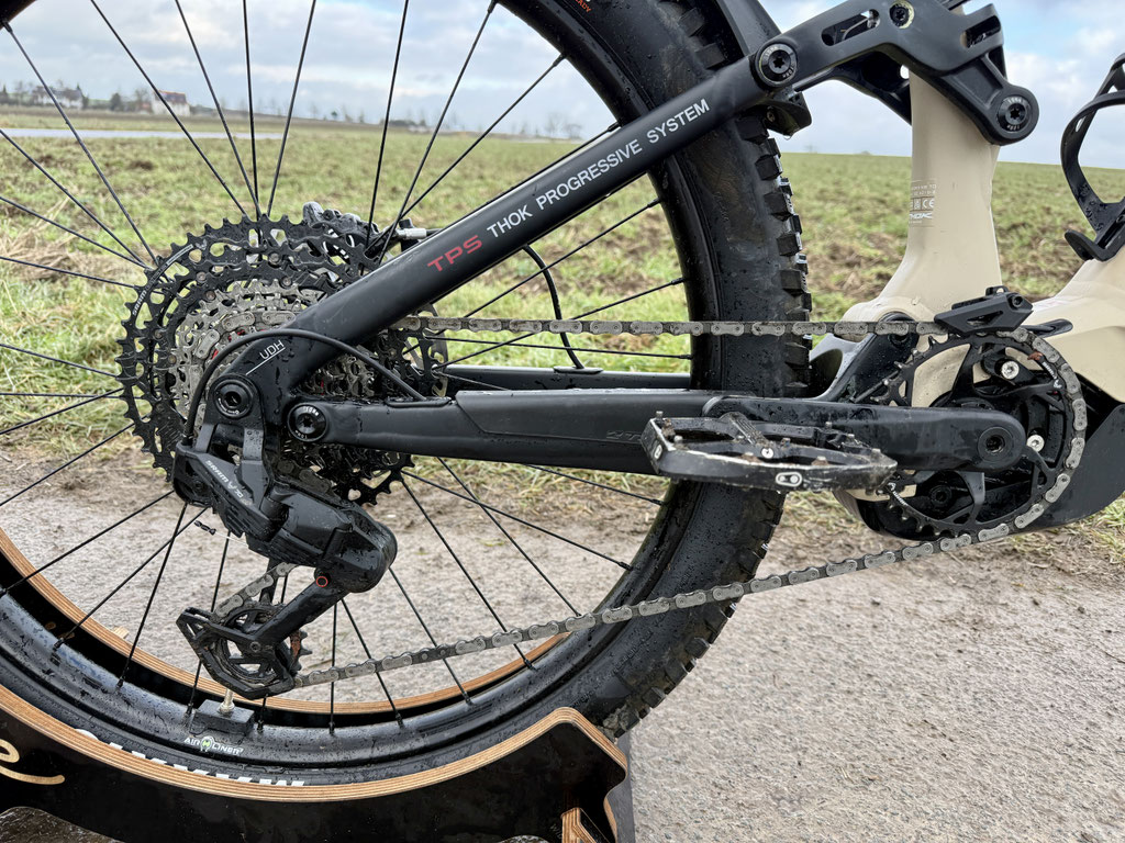 Das Thok TK02 S ist technisch klar auf kompromisslosen Enduro-Einsatz ausgelegt. Herzstück ist der neu verbaute Bosch Performance Line CX der neuesten Generation, der mit seiner kraftvollen und gleichzeitig sehr fein dosierbaren Unterstützung überzeugt. In Kombination mit dem großzügigen 800-Wh-PowerTube-Akku bietet das Bike nicht nur ordentlich Druck an steilen Rampen, sondern auch genug Reichweite für lange, höhenmeterreiche Touren. Gerade im Vergleich zum Vorgänger merkt man, dass der Wechsel auf Bosch ein klarer Schritt in Richtung mehr Power und Konstanz ist.