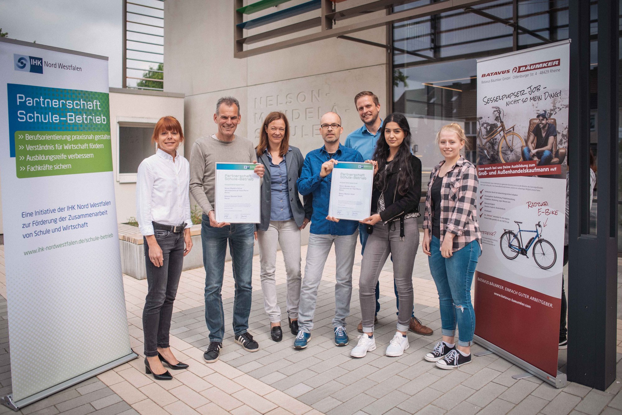 Die Nelson-Mandela-Sekundarschule und die Batavus Bäumker GmbH in Rheine sind offizielle Kooperationspartner im Projekt „Partnerschaft Schule-Betrieb“ der Industrie- und Handelskammer (IHK) Nord Westfalen. Vertreter von Unternehmen und Schule unterzeichneten heute (18. Juni) eine entsprechende Vereinbarung. Damit steigt die Zahl der Kooperationen im Kreis Steinfurt auf 85. Für die Nelson-Mandela-Sekundarschule ist es die dritte Partnerschaft mit einem Unternehmen in der IHK-Initiative.