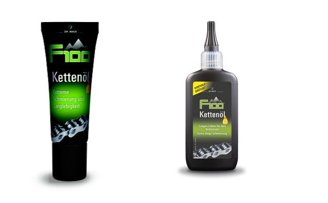 Ab sofort ist das F100 Kettenöl als 10 ml Tube und auch im Vorteilspack in der 100 ml Tropfflasche erhältlich.