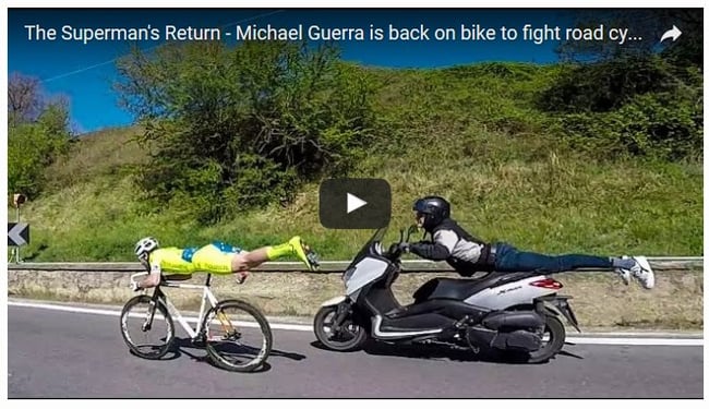 Der erstaunliche Moment, als Michael Guerra sich von seinen Pedalen abhebt, auf seinen Sattel legt und die Beine ausstreckt, um eine ultimative aerodynamische Effizienz zu erzielen. Eine revolutionäre Art, seine Konkurrenten zu überholen - eben Superman auf dem Fahrrad.